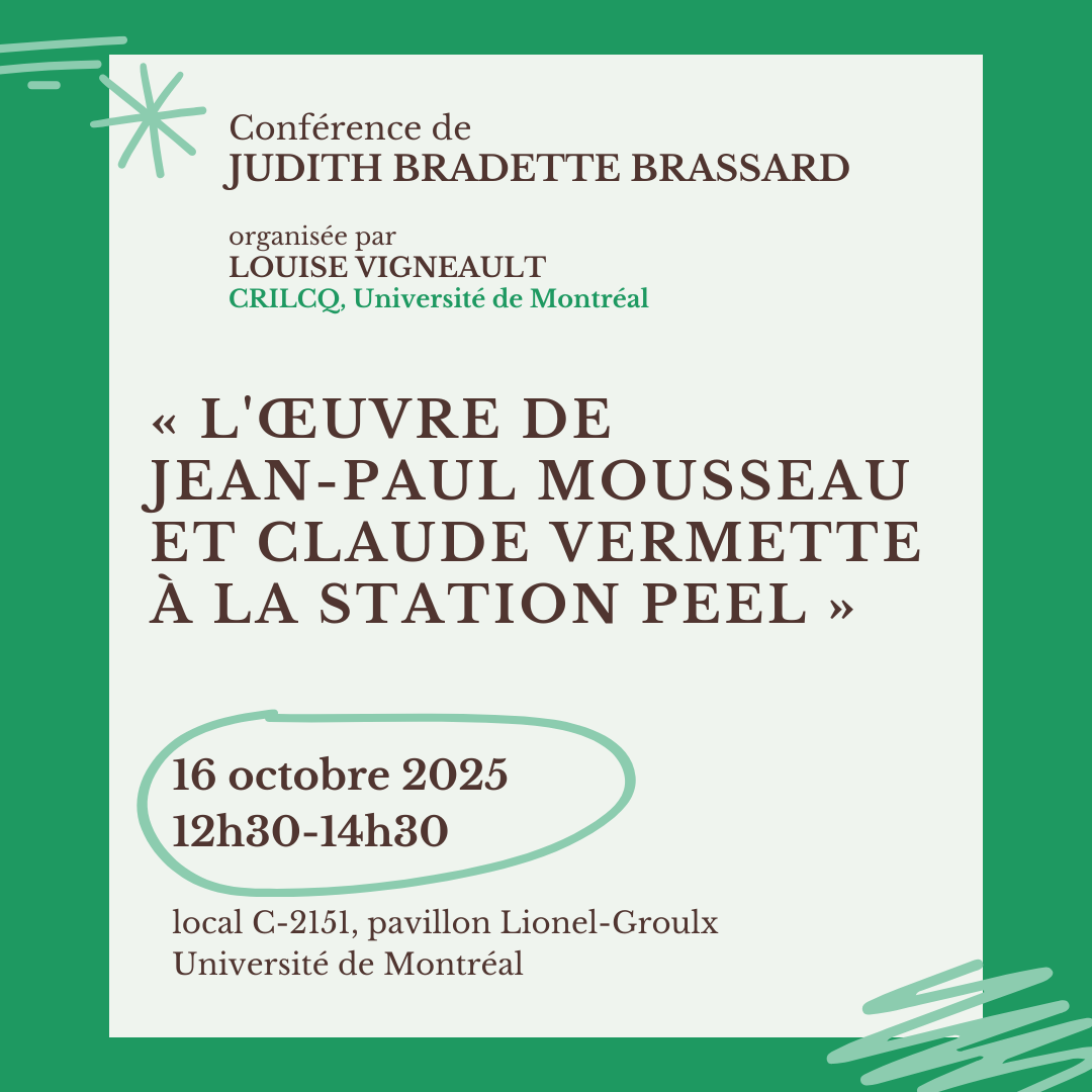 Conférence de Judith Bradette Brassard « L'œuvre de Jean-Paul Mousseau et Claude Vermette à la station Peel »
