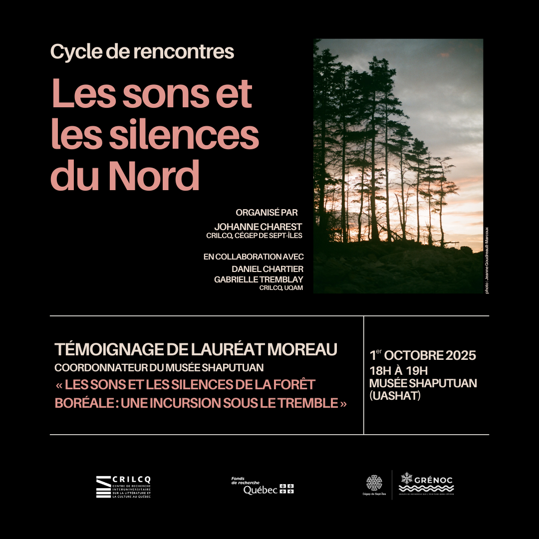 Dans le cadre du cycle de rencontres « Les sons et les silences du Nord », organisé par le Groupe de recherche sur l'écriture nord-côtière (GRÉNOC) en collaboration avec le CRILCQ, Johanne Charest (cochercheuse CRILCQ, Cégep de Sept-Îles) reçoit Lauréat Moreau (coordonnateur du Musée Shaputuan, Uashat) pour un témoignage intitulé « Les sons et les silences de la forêt boréale : une incursion sous le tremble ». L'activité aura lieu le 1er octobre 2025, de 18h à 19h, au Musée Shaputuan (Uashat).