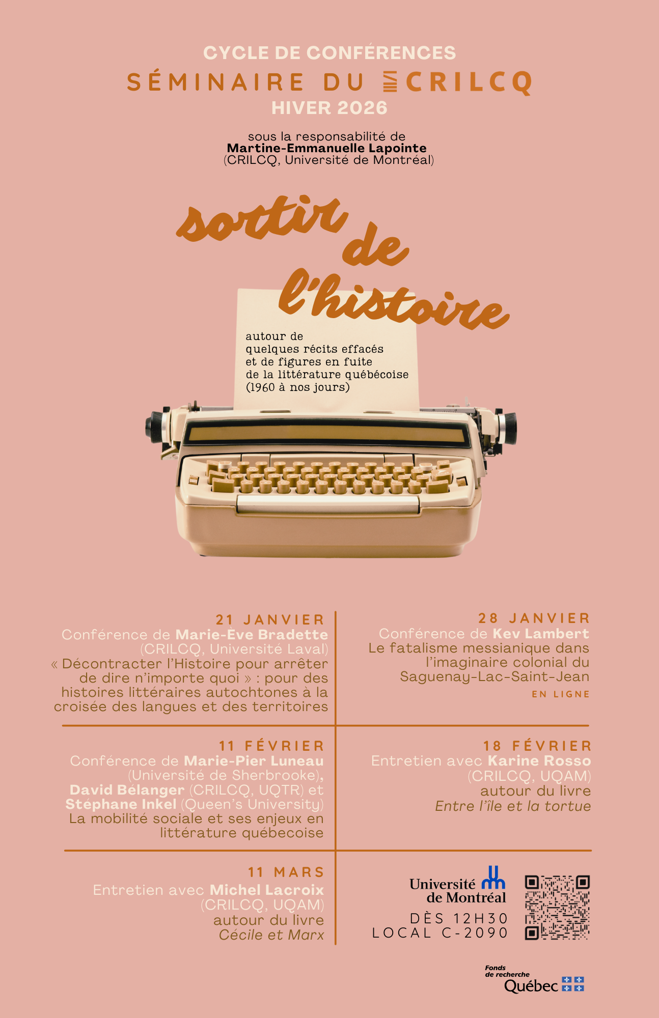 Le cycle de conférences du séminaire du CRILCQ « Sortir de l’histoire : autour de quelques récits effacés et de figures en fuite de la littérature québécoise (1960 à nos jours) », sous la responsabilité de Martine-Emmanuelle Lapointe (cochercheuse CRILCQ, Université de Montréal), aura lieu les mercredis dès 12h30, à l'Université de Montréal, pavillon Lionel-Groulx (C-2090).
