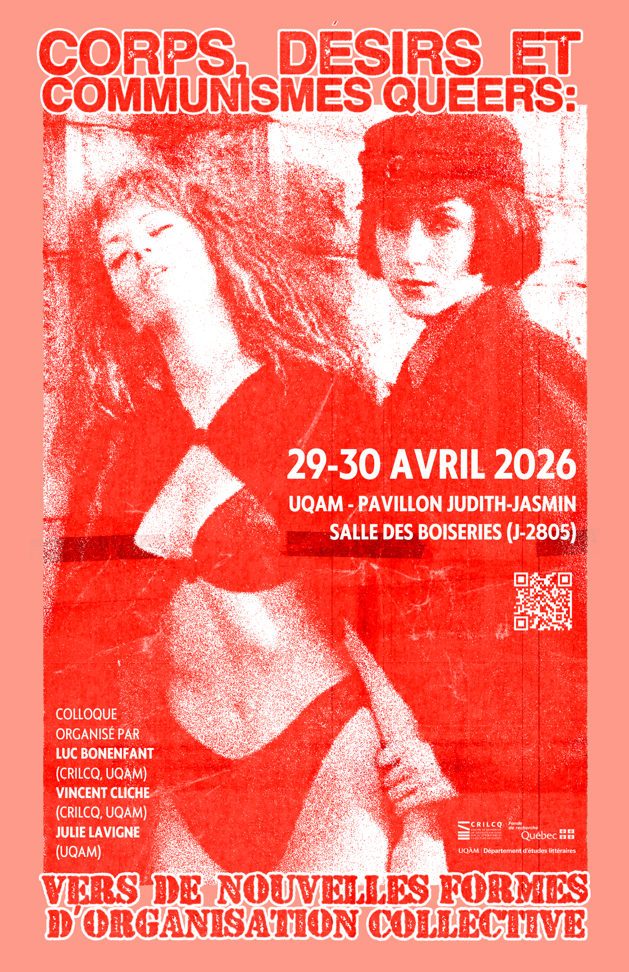 Luc Bonenfant (cochercheur CRILCQ, UQAM), Vincent Cliche (membre étudiant CRILCQ, UQAM) et Julie Lavigne (UQAM) organisent le colloque « Corps, désirs et communismes queers : vers de nouvelles formes d’organisation collective ». L'événement aura lieu les 29 et 30 avril 2026, à l'UQAM, pavillon Judith-Jasmin, Salle des Boiseries (J-2805).