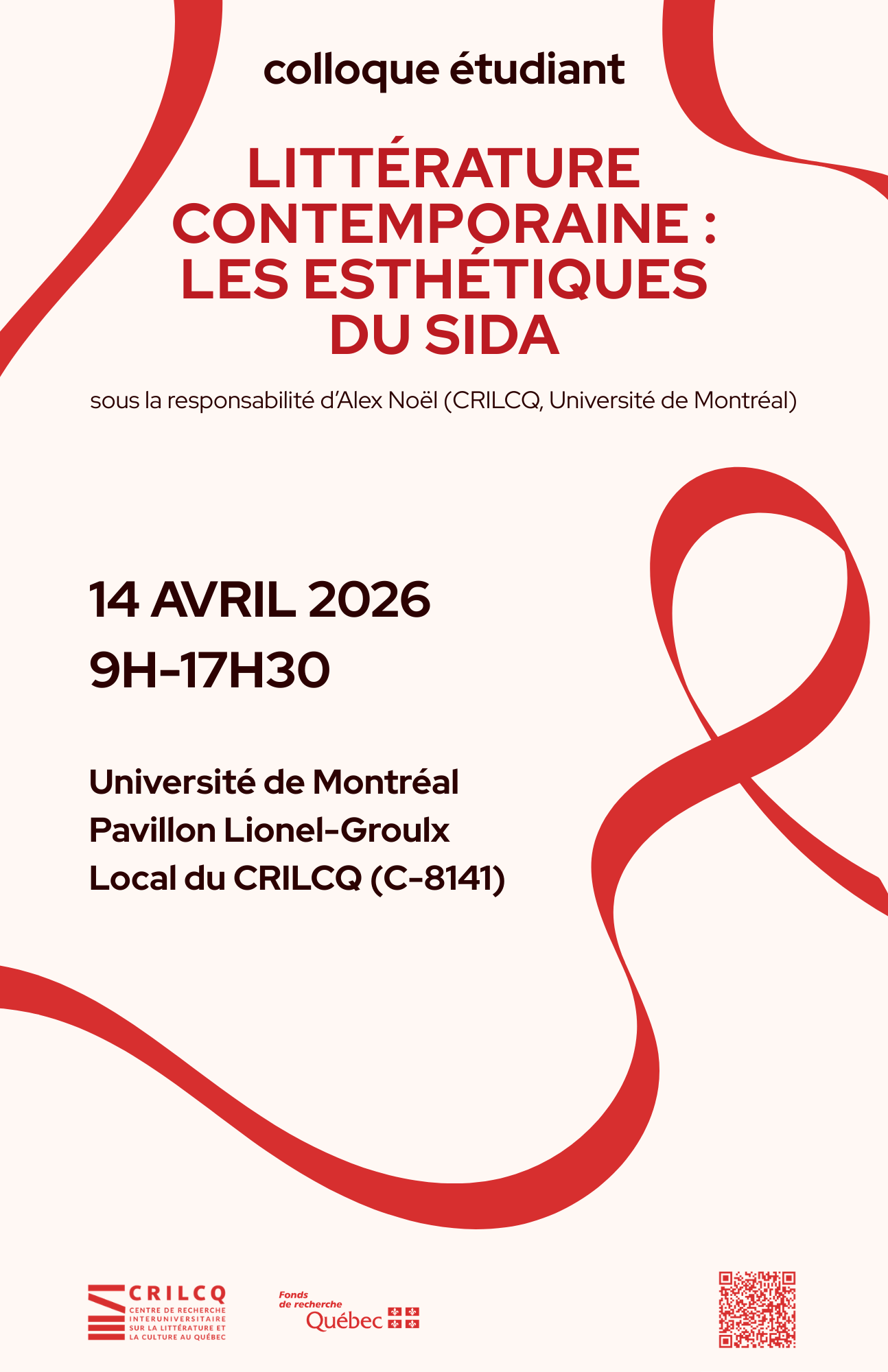 Organisé dans le cadre du séminaire « Littérature contemporaine », le colloque étudiant « Littérature contemporaine : les esthétiques du sida », sous la responsabilité d'Alex Noël (cochercheur CRILCQ, Université de Montréal), se tiendra le 14 avril 2026, de 9h à 17h30, à l'Université de Montréal, pavillon Lionel-Groulx, dans les locaux du CRILCQ (C-8141).