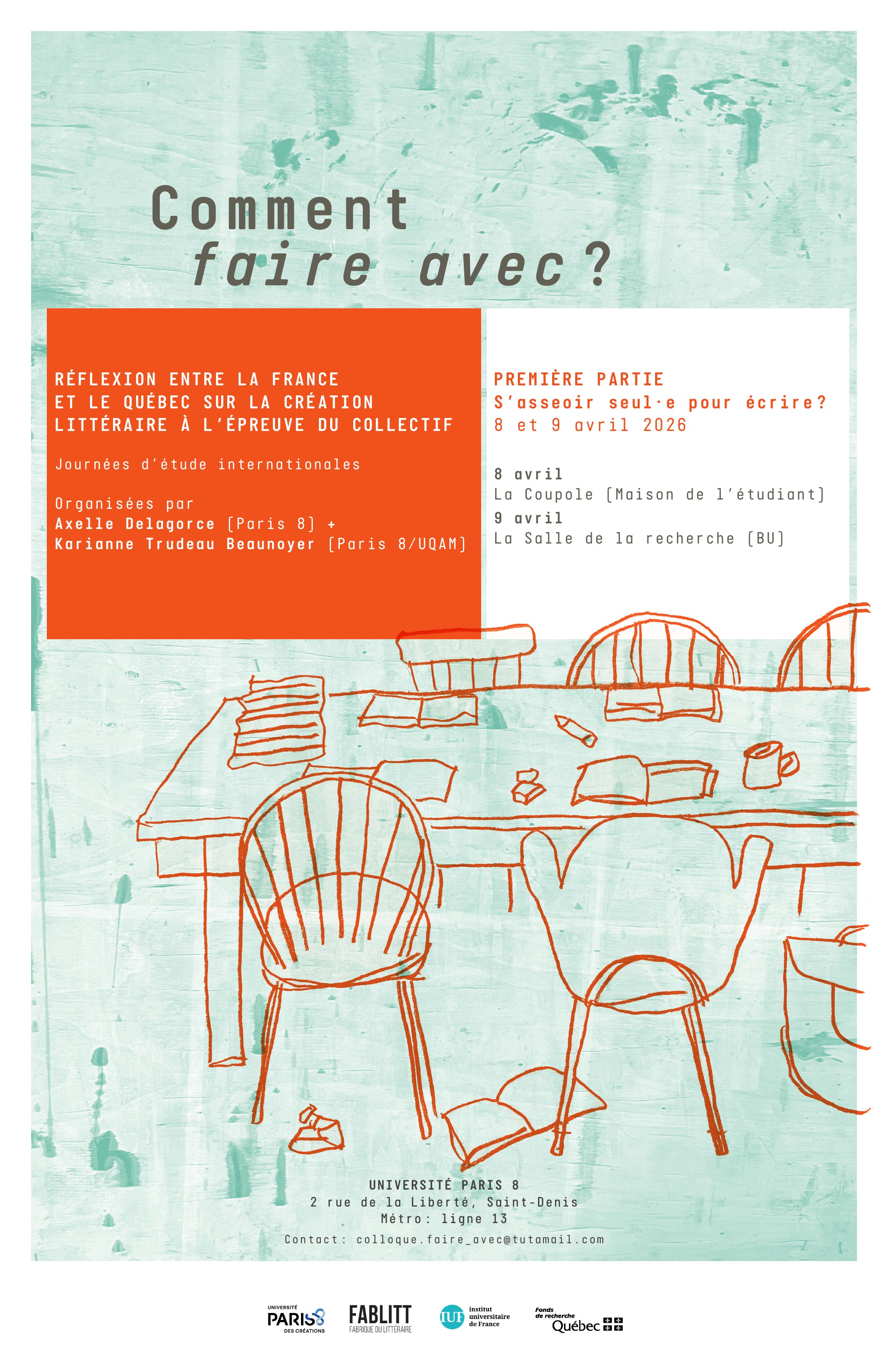 La première partie des journées d'étude internationales « Comment faire avec? Réflexion entre la France et le Québec sur la création littéraire à l’épreuve du collectif », coorganisées par Karianne Trudeau Beaunoyer (stagiaire postdoctorale CRILCQ, UQAM/Université Paris 8) et Axelle Delagorce (Université Paris 8), intitulée « S’asseoir seul·e pour écrire? » aura lieu les 8 et 9 avril 2026, à l'Université Paris 8 Vincennes–Saint-Denis.