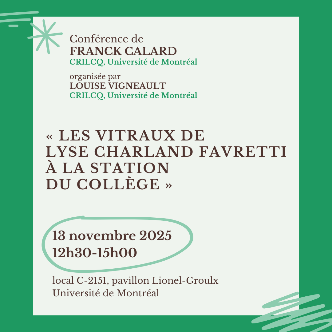 Dans le cadre du cycle de conférences du séminaire de maîtrise « Arts et cultures des Amériques - L'art dans le métro de Montréal : humaniser et dynamiser l'espace » sous la responsabilité de Louise Vigneault (cochercheuse CRILCQ, Université de Montréal), Franck Calard (membre étudiant CRILCQ, Université de Montréal) donnera la conférence « Les vitraux de Lyse Charland Favretti à la station Du Collège » le 13 novembre 2025, de 12h30 à 15h, à l'Université de Montréal, pavillon Lionel-Groulx, local C-2151.