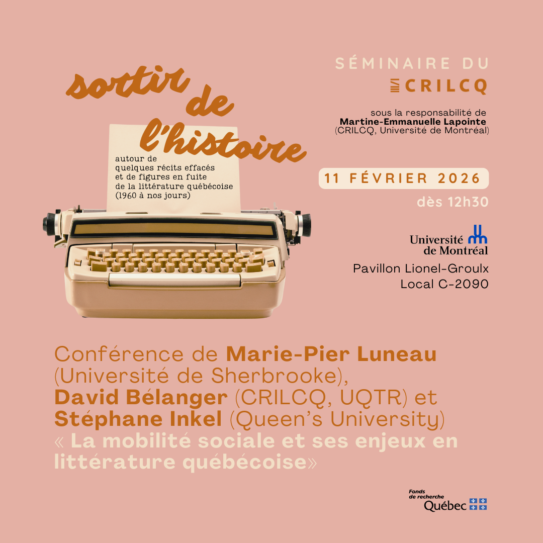 Dans le cadre du Séminaire du CRILCQ « Sortir de l’histoire : autour de quelques récits effacés et de figures en fuite de la littérature québécoise (1960 à nos jours) », sous la responsabilité de Martine-Emmanuelle Lapointe (cochercheuse CRILCQ, Université de Montréal), Marie-Pier Luneau (Université de Sherbrooke), David Bélanger (CRILCQ, UQTR) et Stéphane Inkel (Queen’s University) donneront la conférence « La mobilité sociale et ses enjeux en littérature québécoise ».