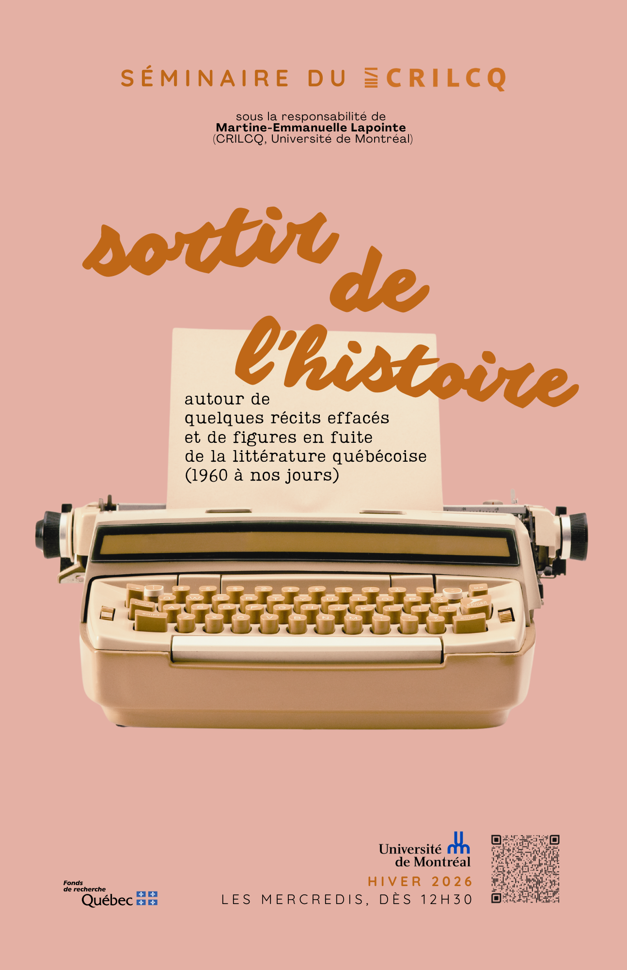 Le séminaire du CRILCQ de l’hiver 2026 intitulé « Sortir de l’histoire : autour de quelques récits effacés et de figures en fuite de la littérature québécoise (1960 à nos jours) », sous la responsabilité de Martine-Emmanuelle Lapointe (cochercheuse CRILCQ, Université de Montréal), aura lieu les mercredis dès 12h30, à l'Université de Montréal.