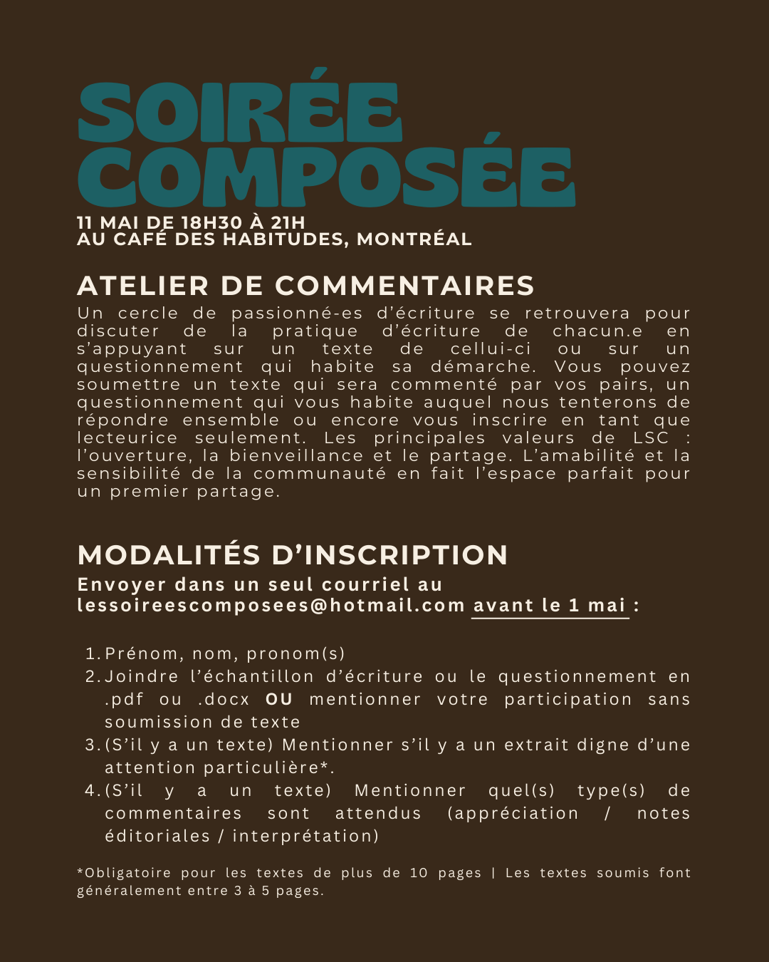 Alexandra Thibault (membre étudiante CRILCQ, UQAM) organise les Soirées composées (LSC). La deuxième soirée de la session prendra la forme d'un atelier de commentaires et aura lieu le 11 mai 2026, de 18h30 à 21h, au Café des Habitudes (1104 Rue Saint-Zotique Est, Montreal).