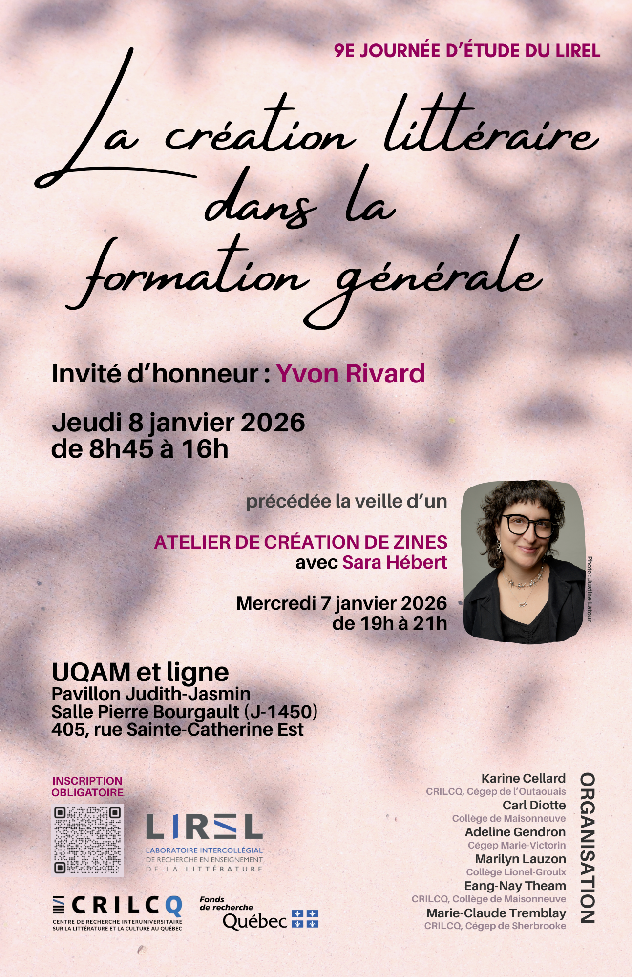 Le Laboratoire intercollégial de recherche en enseignement de la littérature (LIREL) organise sa 9e journée d’étude « La création littéraire dans la formation générale ». L’activité aura lieu les 7 et 8 janvier 2026, à l’UQAM, à la Salle Pierre-Bourgault du pavillon Judith-Jasmin et en ligne.