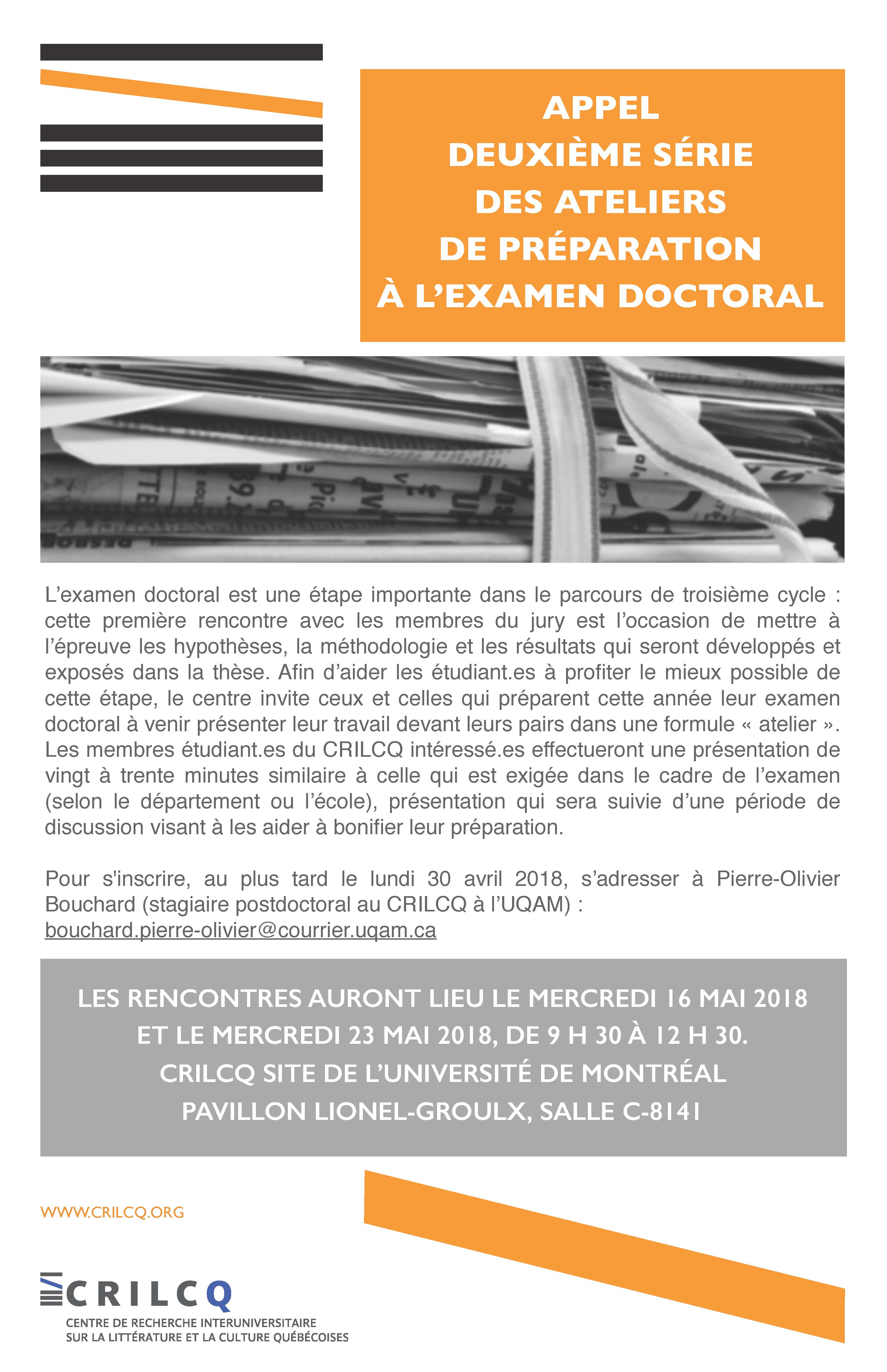 L’examen doctoral est une étape importante dans le parcours de troisième cycle : cette première rencontre avec les membres du jury est l’occasion de mettre à l’épreuve les hypothèses, la méthodologie et les résultats qui seront développés et exposés dans la thèse. Afin d’aider les étudiant.es à profiter le mieux possible de cette étape, le centre invite ceux et celles qui préparent cette année leur examen doctoral à venir présenter leur travail devant leurs pairs dans une formule « atelier ». Les membres étudiant.es du CRILCQ intéressé.es effectueront une présentation de vingt à trente minutes similaire à celle qui est exigée dans le cadre de l’examen (selon le département ou l’école), présentation qui sera suivie d’une période de discussion visant à les aider à bonifier leur préparation.