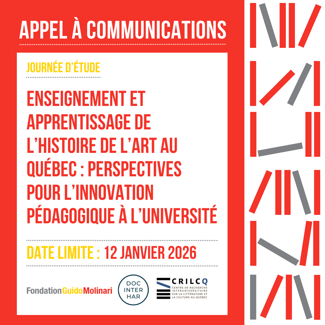 L’appel pour la journée d’étude « Enseignement et apprentissage de l’histoire de l’art au Québec – Perspectives pour l’innovation pédagogique à l’université », coorganisée par Franck Calard (membre étudiant CRILCQ, Université de Montréal) et Anna Papacostidis (Université de Montréal) est lancé! La journée d’étude se tiendra le 31 mars 2026 à la Fondation Guido Molinari.