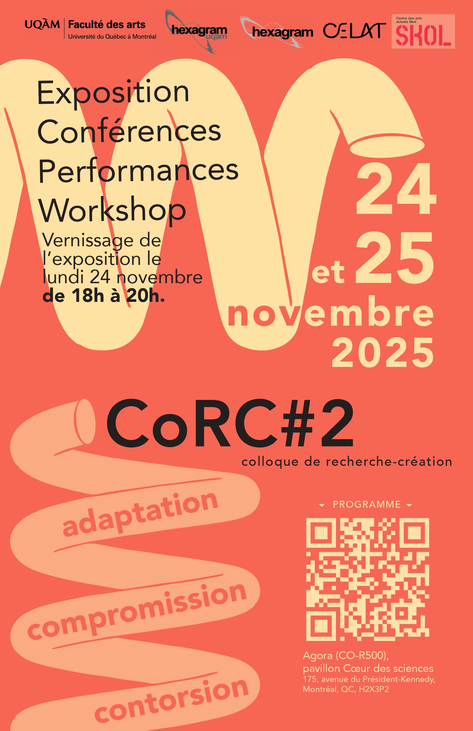 La deuxième édition du CoRC, colloque en recherche-création, coorganisée par Charline P. William, Dorah S. Claude, Pasiphaé Leclère, Paloma Leyton, minette carole djamen nganso (membre étudiante CRILCQ, UQAM), Elvire Colin-Madan (membre étudiant·e CRILCQ, UQAM), Yamile Villamil Rojas, Léo Yonis Henni (membre étudiant·e CRILCQ, UQAM), est intitulée « Adaptation · Contorsion · Compromission ». L’activité aura lieu les 24 et 25 novembre 2025, à l’Agora du Cœur des sciences de l’UQAM (CO-R500).
