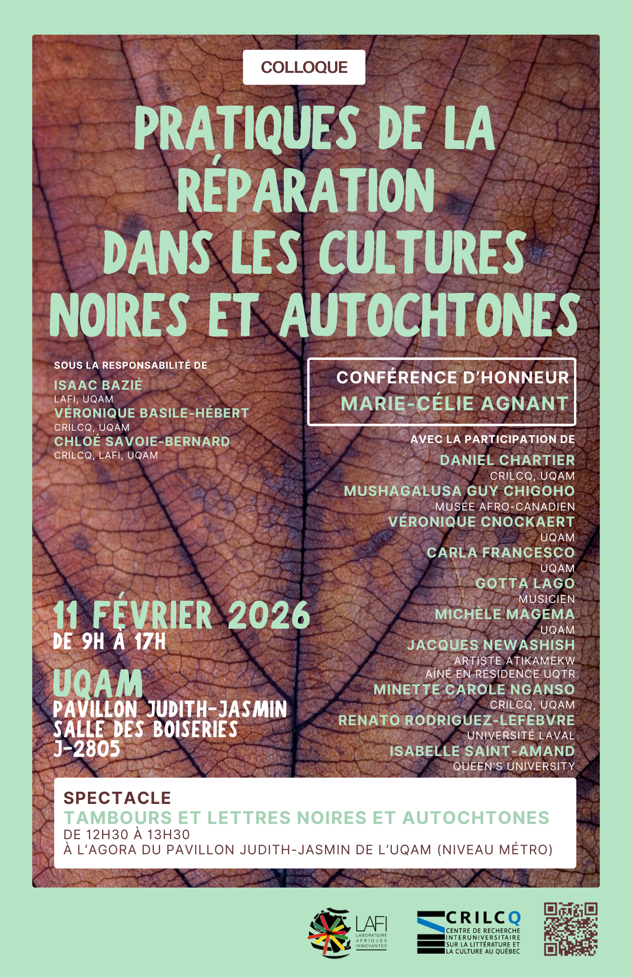 Le Laboratoire des Afriques Innovantes (LAFI) organise le colloque « Pratiques de la réparation dans les cultures noires et autochtones », sous la responsabilité d’Isaac Bazié (LAFI, UQAM), Véronique Basile-Hébert (membre étudiante CRILCQ, UQAM) et Chloé Savoie-Bernard (cochercheuse CRILCQ, LAFI, UQAM), le 11 février 2026, de 9h à 17h, à l’UQAM, pavillon Judith-Jasmin, salle des Boiseries (J-2805).