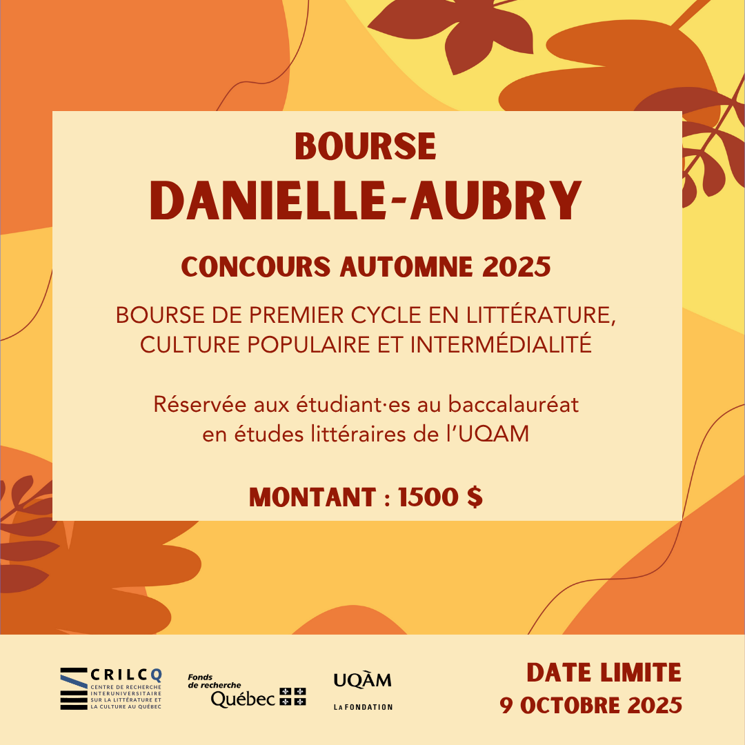 L’objectif de la Bourse Danielle-Aubry – CRILCQ est d’appuyer des étudiant·es au baccalauréat en études littéraires, intéressé·es par la culture populaire ou l’intermédialité (incluant les études sur la littérature, la radio, la télévision, le cinéma, les fictions web).