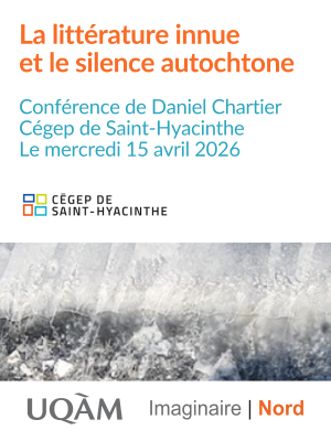 Dans le cadre des travaux du Laboratoire international de recherche sur l’imaginaire du Nord, de l’hiver et de l’Arctique, Daniel Chartier (CRILCQ, UQAM) donnera la conférence « La littérature innue et le silence autochtone ». Organisée par Laura Perez-Gauvreau, l’activité se tiendra le mercredi 15 avril 2026, à 13h, au Cégep de Saint-Hyacinthe, salle G-1220.