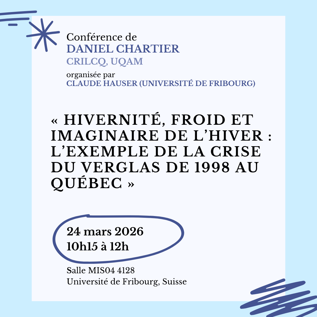 Dans le cadre du séminaire « L’hiver, une saison pour l’Histoire? Sports-Cultures-Environnement entre Québec, Scandinavie et Suisse », sous la responsabilité de Claude Hauser (Université de Fribourg), Daniel Chartier (cochercheur CRILCQ, UQAM) donnera la conférence « Hivernité, froid et imaginaire de l’hiver : l’exemple de la crise du verglas de 1998 au Québec ». L’événement aura lieu le 24 mars 2026 de 10h15 à 12h à l’Université de Fribourg, salle MIS04 4128 (Avenue de l’Europe 20, 1700 Fribourg).