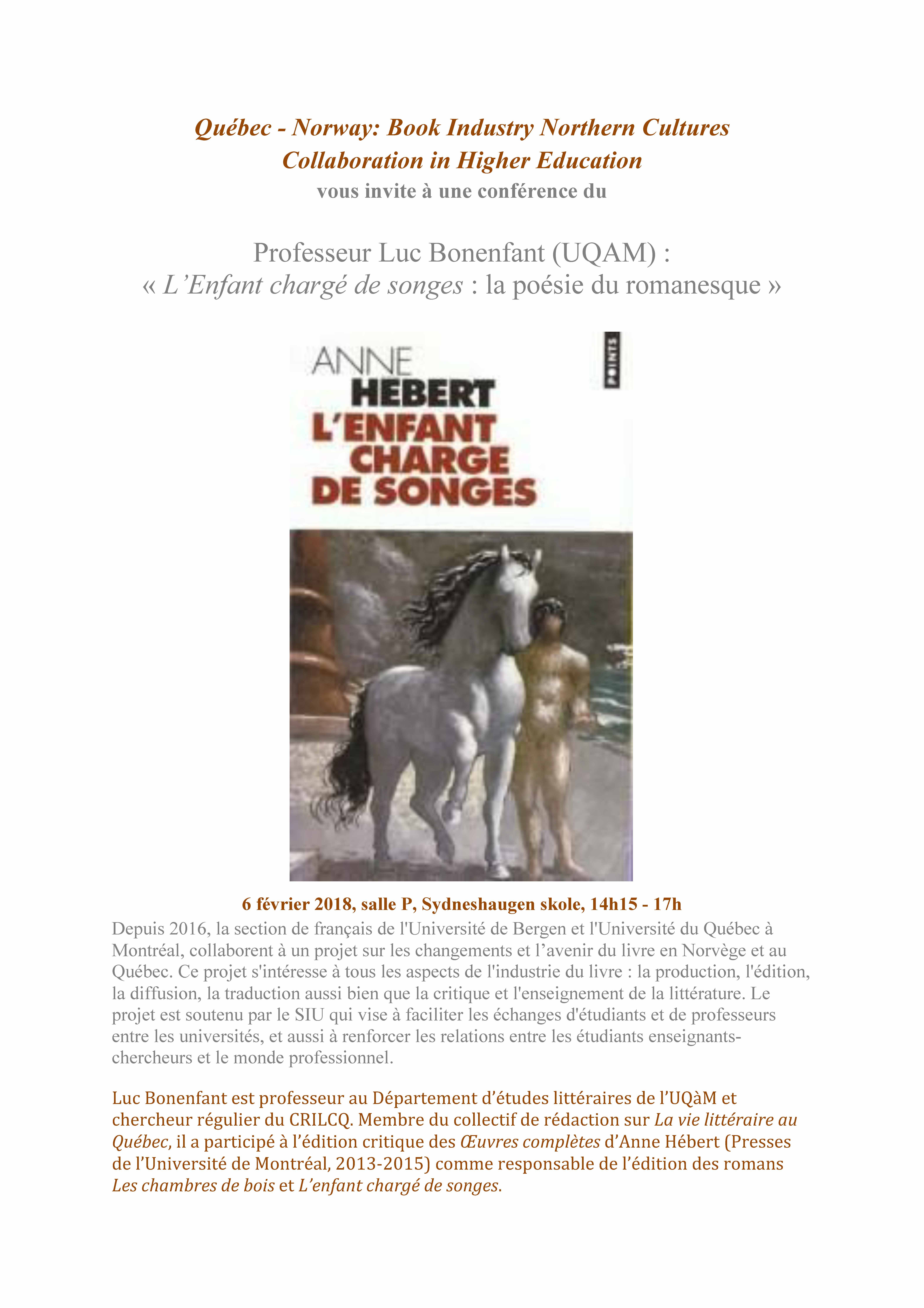 Luc Bonenfant (CRILCQ à l’UQAM) donnera une conférence intitulée « L’enfant chargé de songes : la poésie du romanesque ». Le projet « Québec – Norway: Book Industry Northern Cultures Collaboration in Higher Education » vous invite à cette conférence qui aura lieu le mardi 6 février 2018, de 14 h 15 à 17h, à la salle P, Sydneshaugen skole de l’Université de Bergen (Norvège).