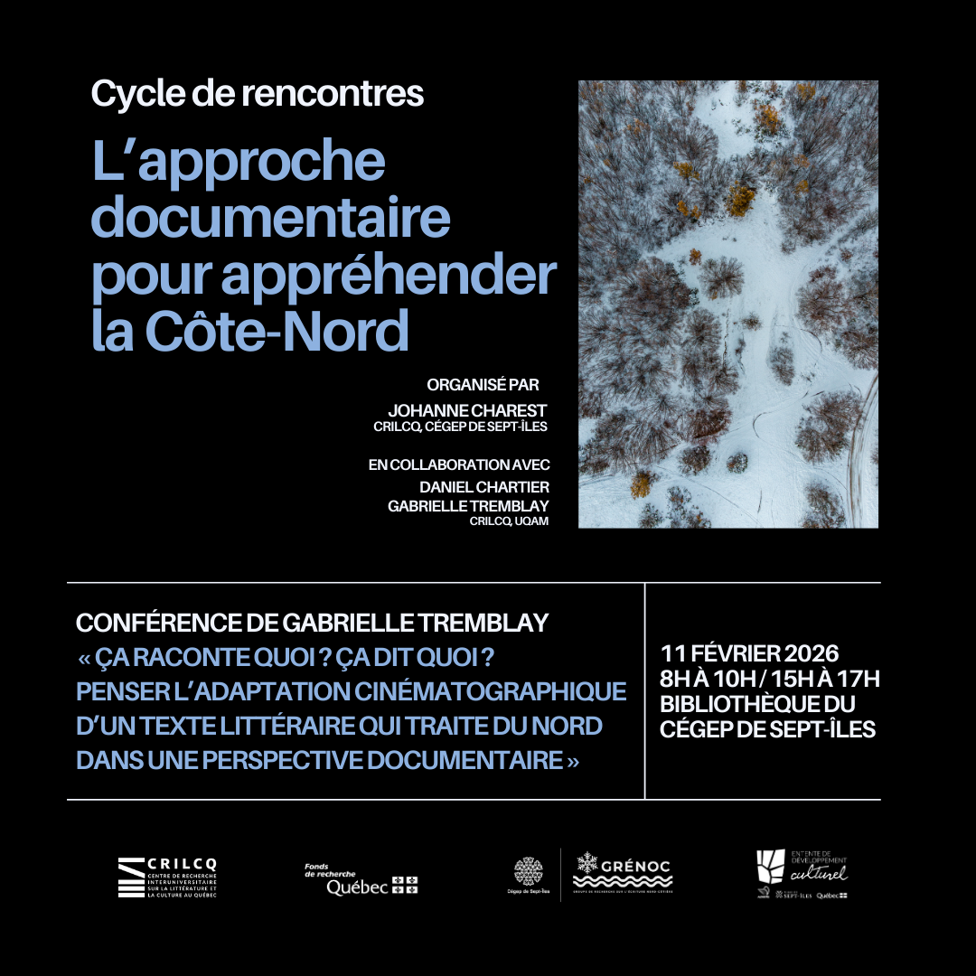 Dans le cadre du cycle de rencontres « L’approche documentaire pour appréhender la Côte-Nord », organisé par le Groupe de recherche sur l’écriture nord-côtière (GRÉNOC) en collaboration avec le CRILCQ, Gabrielle Tremblay (cochercheuse CRILCQ, UQAM) donne la conférence « Ça raconte quoi ? Ça dit quoi ? Penser l’adaptation cinématographique d’un texte littéraire qui traite du Nord dans une perspective documentaire ». L’activité aura lieu le 11 février 2026, de 8h à 10h et 15h à 17h, à la bibliothèque du Cégep de Sept-Îles (local G-200).