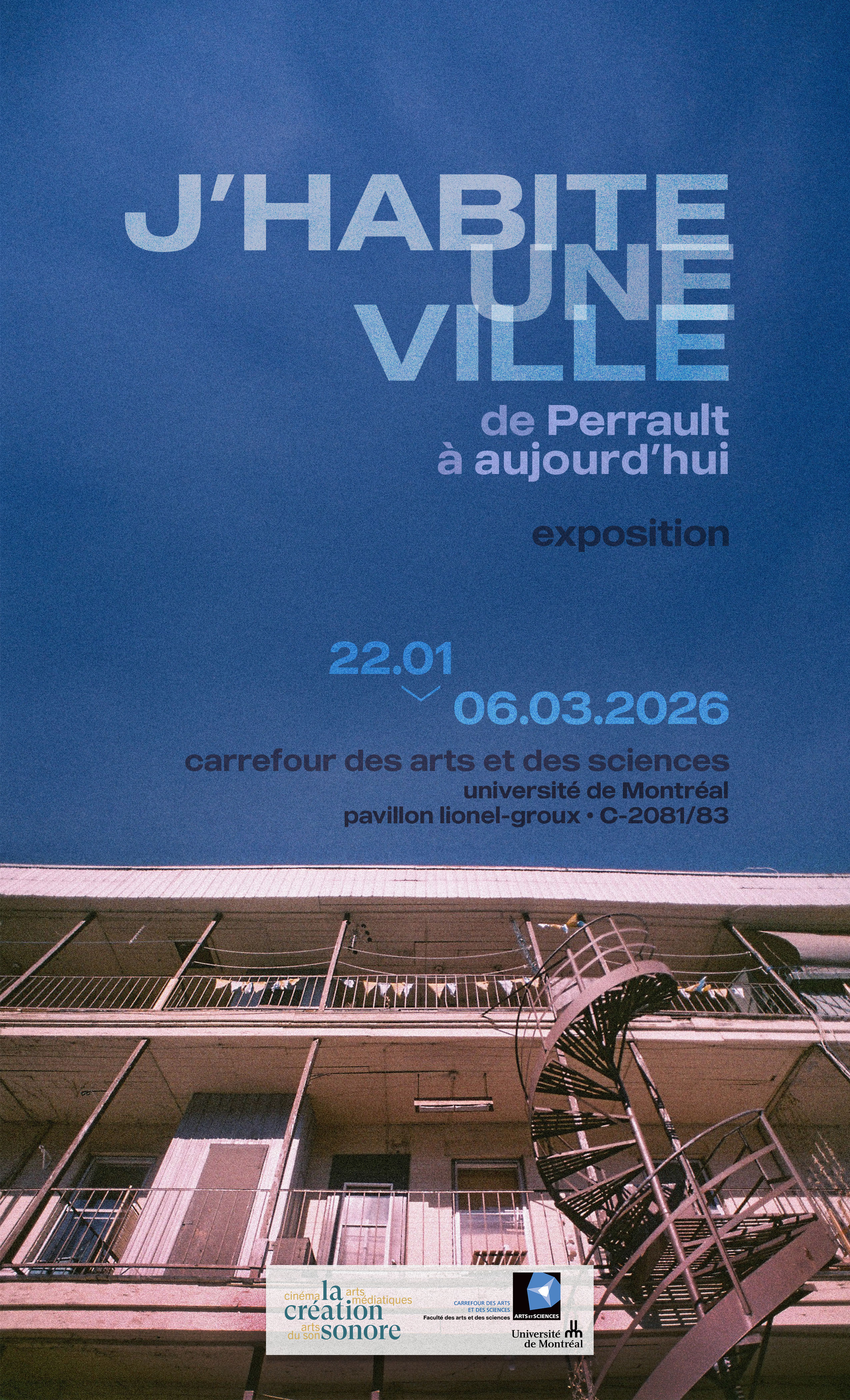 Sous le commissariat des étudiant·es de l’Université de Montréal Antoine Amnotte-Dupuis, Frédérique Paré-Bastarache (membre étudiante CRILCQ) et Héloïse Gruz, l’exposition « J’habite une ville : de Perrault à aujourd’hui » est présentée au Carrefour des arts et des sciences de l’Université de Montréal, salle C-2081/83, du 22 janvier au 6 mars 2026.