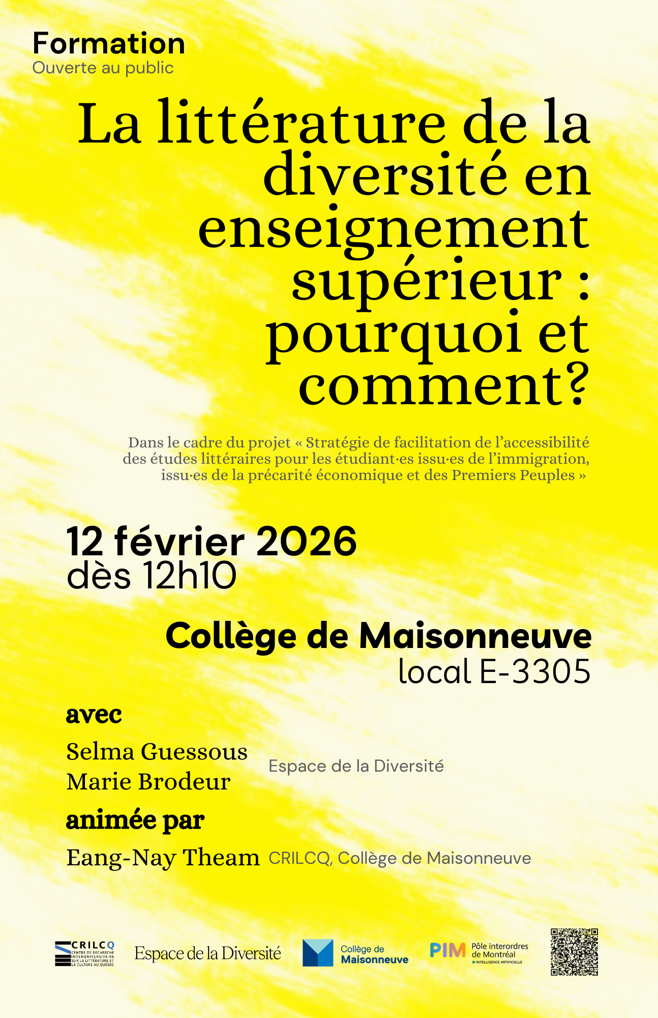 L’équipe du projet « Stratégie de facilitation de l’accessibilité des études littéraires pour les étudiant·es issu·es de l’immigration, issu·es de la précarité économique et des Premiers Peuples», Eang-Nay Theam (cochercheuse CRILCQ, Collège de Maisonneuve), Daniel Chartier (cochercheur CRILCQ, UQAM), Jean Sébastien (Collège de Maisonneuve), Sylvain Brehm (UQAM), Jacinthe Bédard (Collège de Maisonneuve), Marie-Pier Bourret-Lafleur (Collège de Maisonneuve), Karine Rosso (cochercheuse CRILCQ, UQAM) et Véronique Cnockaert (UQAM), organise la formation « La littérature de la diversité en enseignement supérieur : pourquoi et comment? » avec Selma Guessous (Directrice générale de l’Espace de la Diversité) et Marie Brodeur (Espace de la Diversité). L’activité aura lieu le 12 février 2026, dès 12h10, au Collège de Maisonneuve (local E-3305).