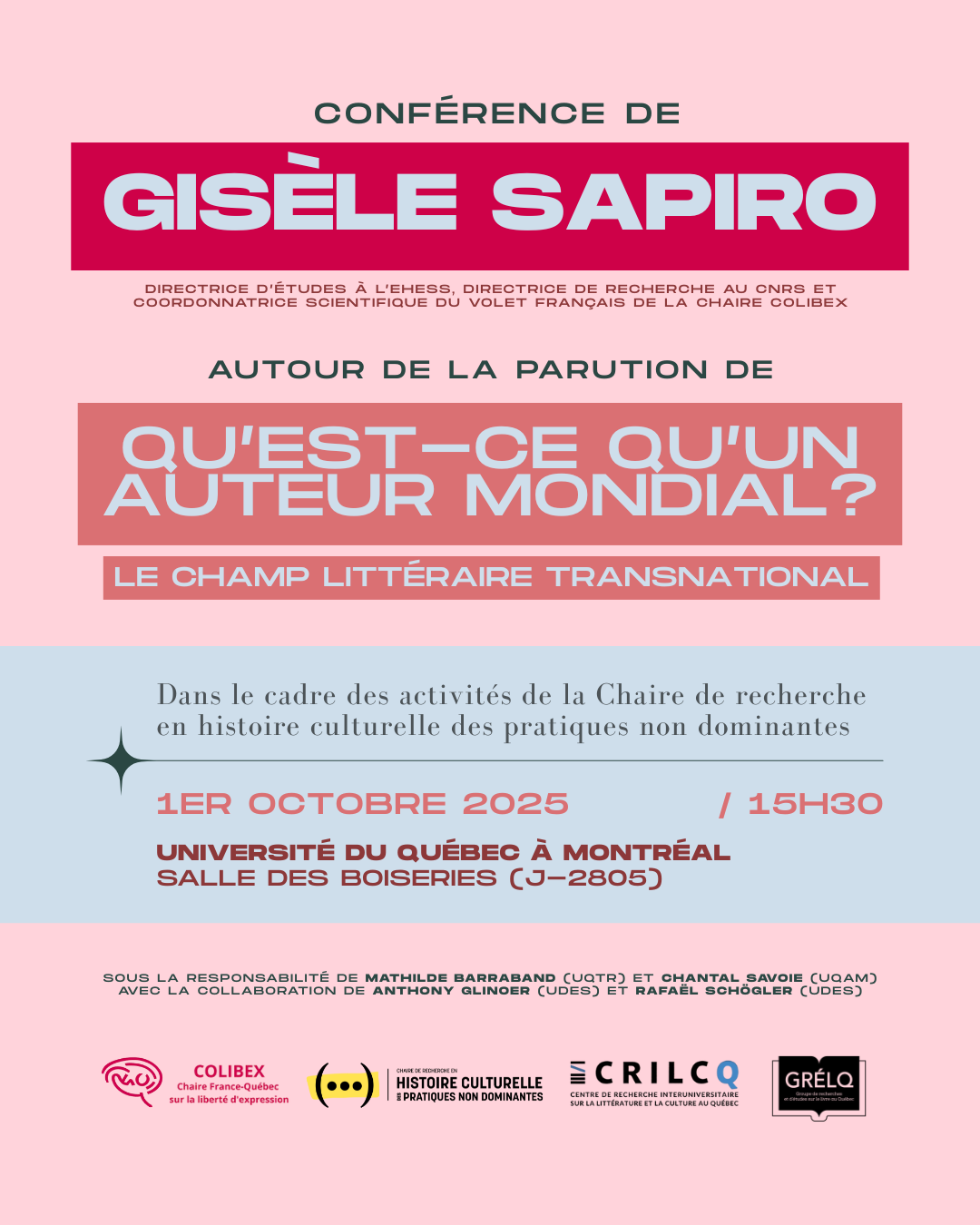 La captation vidéo de la conférence donnée par Gisèle Sapiro (coordonnatrice scientifique du volet français de la chaire COLIBEX, directrice d’études à l’EHESS et directrice de recherche au CNRS) autour de la parution de Qu’est-ce qu’un auteur mondial ? Le champ littéraire transnational dans le cadre de la programmation de la Chaire de recherche en histoire culturelle des pratiques non dominantes est désormais disponible dans la Médiathèque du CRILCQ.