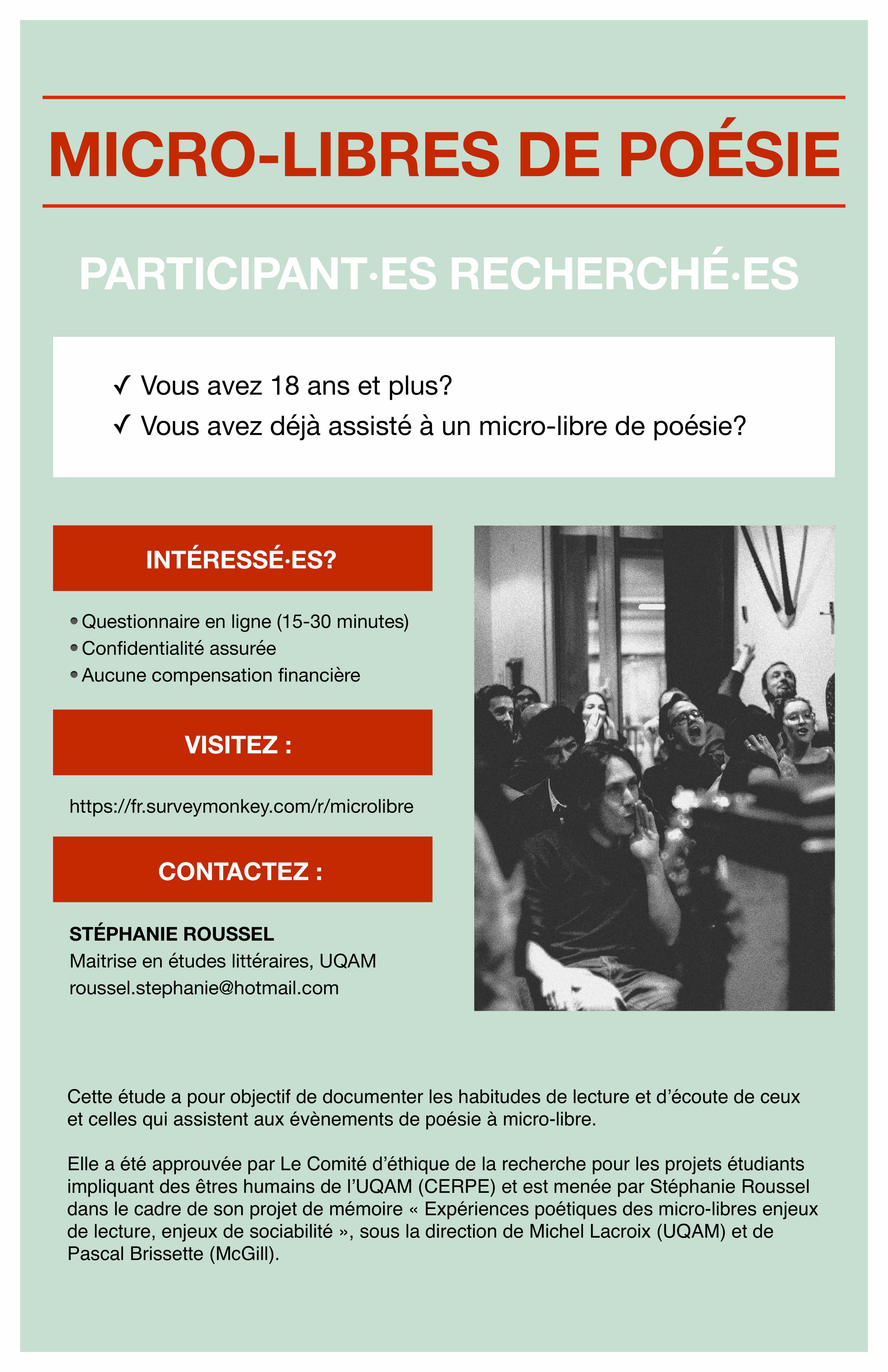 Mon projet de maitrise en études littéraires, que j’effectue à l’UQAM, porte sur les évènements de poésie à micro-libre.