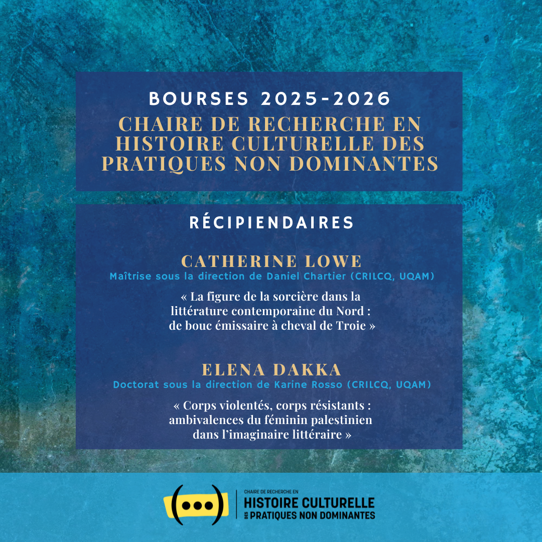 Le CRILCQ a le plaisir d’annoncer les candidatures retenues pour les bourses 2025-2026 de la Chaire de recherche en histoire culturelle des pratiques non dominantes :