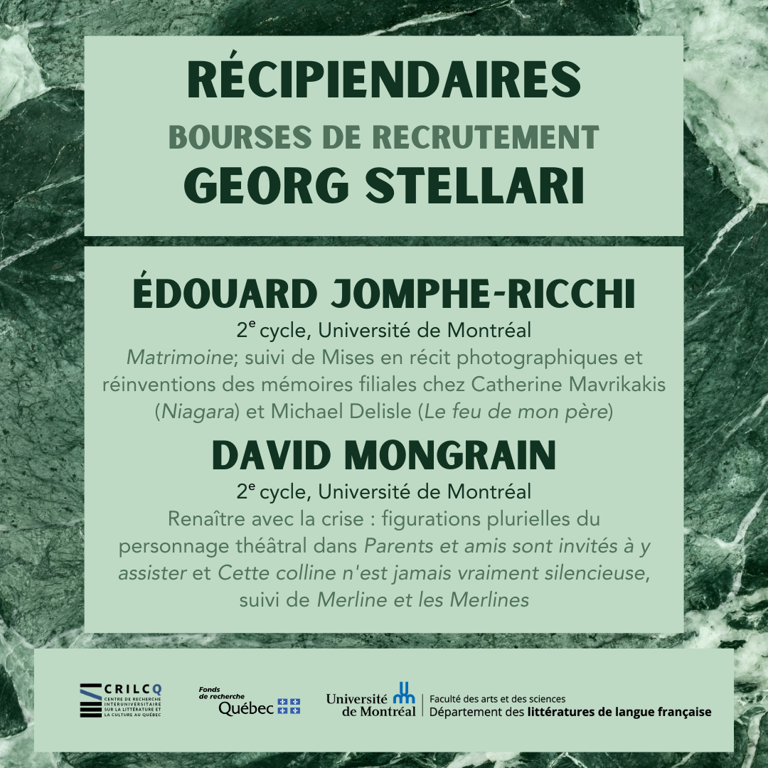 - Édouard Jomphe-Ricchi (membre étudiant CRILCQ, Université de Montréal) pour son projet « Matrimoine; suivi de Mises en récit photographiques et réinventions des mémoires filiales chez Catherine Mavrikakis (Niagara) et Michael Delisle (Le feu de mon père) », sous la codirection de Martine-Emmanuelle Lapointe et Claire Legendre ;