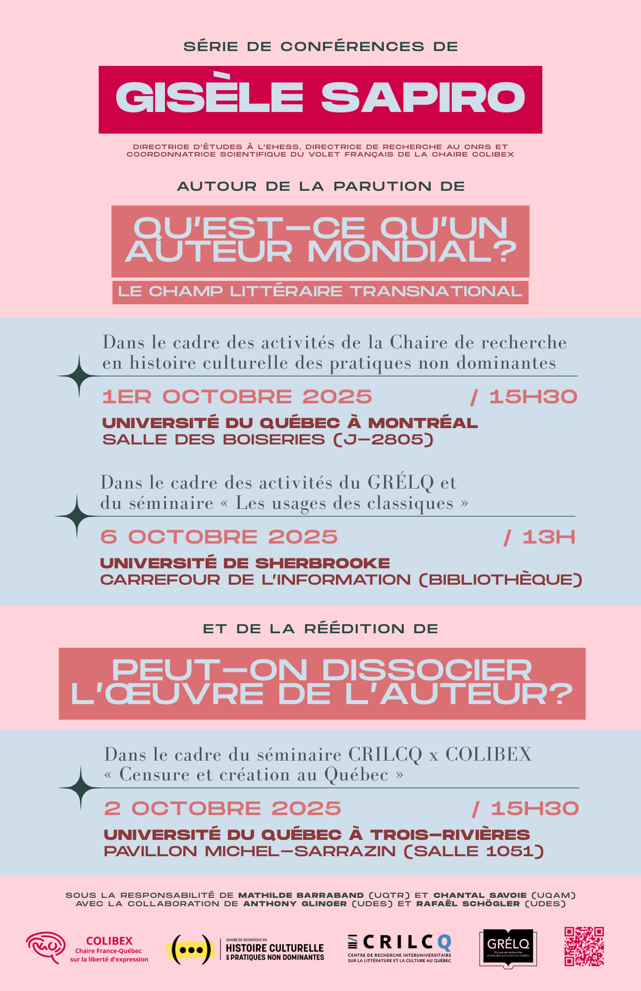 - dans le cadre du séminaire CRILCQ x COLIBEX « Censure et création au Québec » : le 2 octobre, à l’UQTR.
