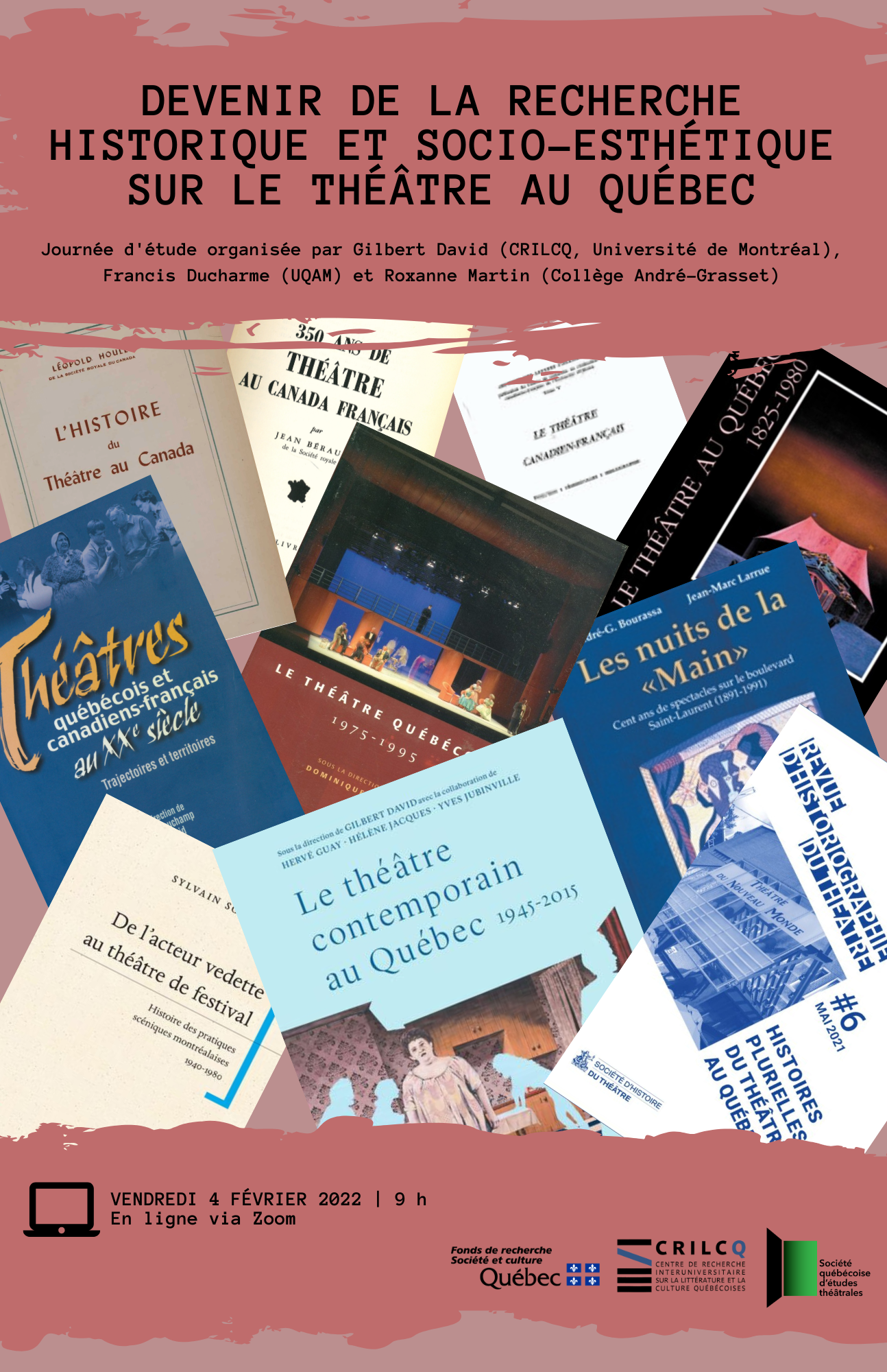 La journée d’étude consacrée au « Devenir de la recherche historique et socio-esthétique sur le théâtre au Québec », organisée par Gilbert David (CRILCQ, Université de Montréal), Francis Ducharme (UQAM) et Roxanne Martin (Collège André-Grasset), était d’abord l’occasion d’effectuer un retour critique sur deux publications récentes dans le domaine, soit Le théâtre contemporain au Québec 1945-2015 (sous la direction de Gilbert David, PUM, 2020) et « Histoires plurielles du théâtre au Québec » (sous la direction de Hervé Guay (CRILCQ, UQTR) et Yves Jubinville (CRILCQ, UQAM), dossier en ligne de la Revue d’historiographie du théâtre, no 6, mai 2021). Mais un tel examen avait aussi comme but d’explorer les possibilités liées à la poursuite à moyen terme de la recherche sur le théâtre québécois.