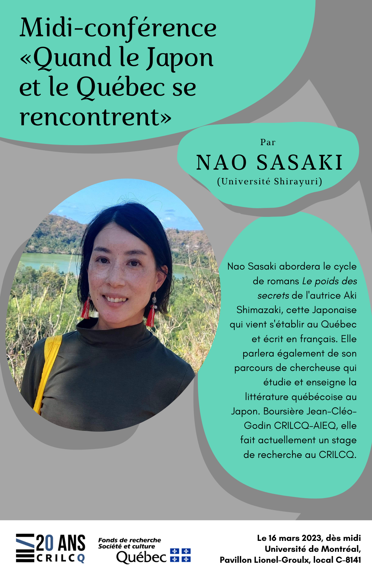 Nao Sasaki (Université Shirayuri) aborde le cycle de romans Le poids des secrets de l’autrice Aki Shimazaki, cette Japonaise qui vient s’établir au Québec et écrit en français. Elle parle également de son parcours de chercheuse qui étudie et enseigne la littérature québécoise au Japon.